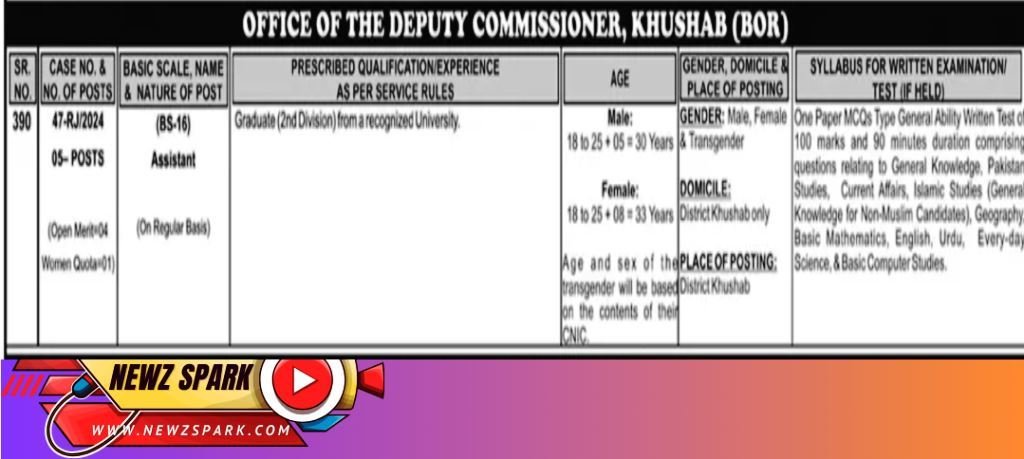 5 Jobs for Assistant in Deputy Commissioner Office Khushab (BOR) 2024