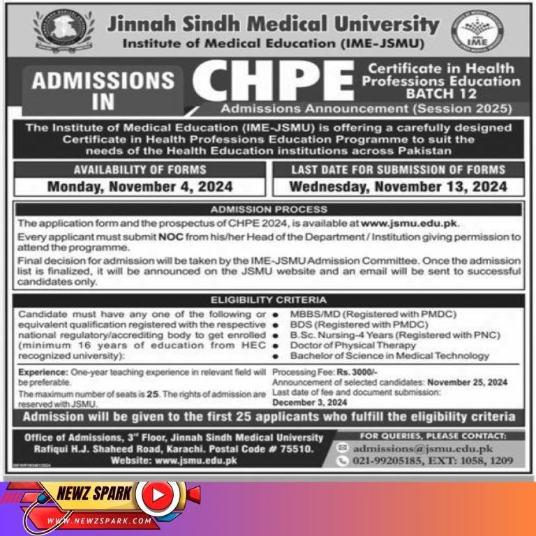 Admission Notice for Certificate for Health Professions Education (CHPE) in Jinnah Sindh Medical University 2025