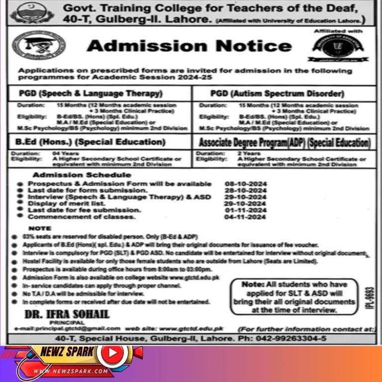Admission Notice for Post Graduate and B.ED (Hons.) in Govt. Training College for Teachers of the Deaf 2024-2025