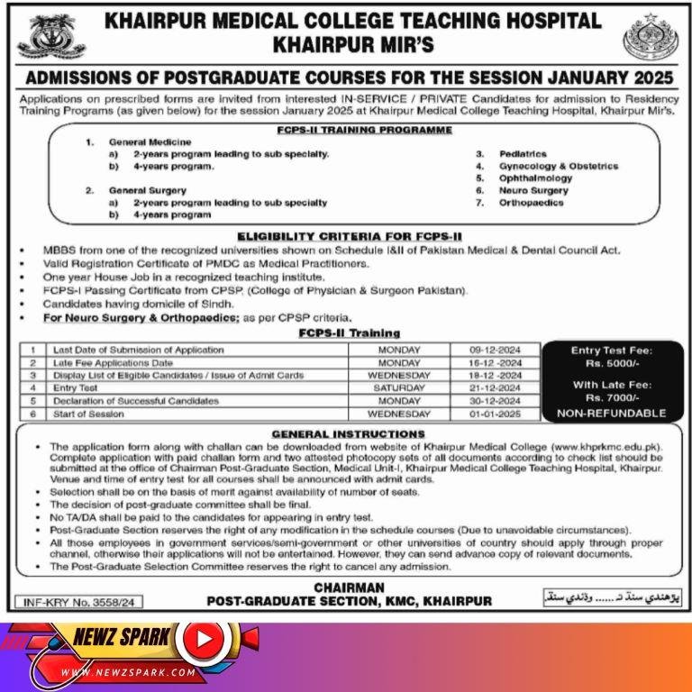 Admission Notice for Residency Training Postgraduate Programmes of Neuro Surgery, Gynecology, Ophthalmology, Pediatrics, General Surgery and Medicine in Khairpur Medical College Teaching Hospital 2025