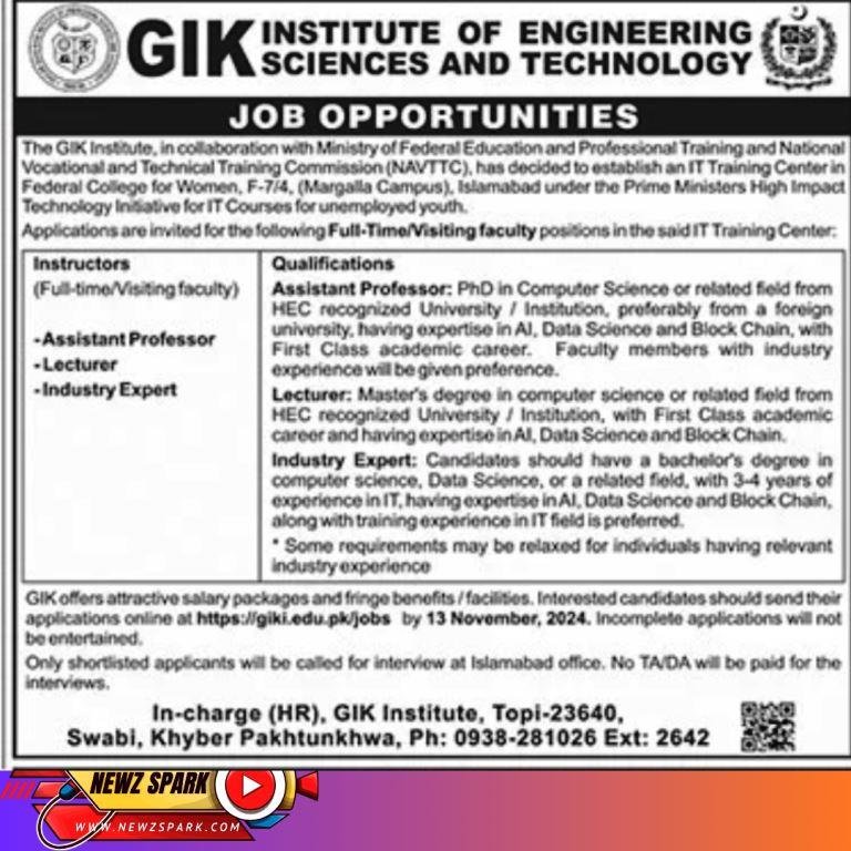 Assistant Professor, Lecturer and Industry Experts Jobs in GIK Institute of Engineering and Technology Swabi 2024