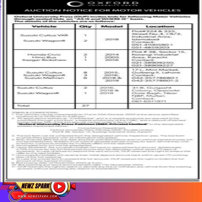 Auction Notice for Motor Vehicles in Oxford University Press Pakistan 2024