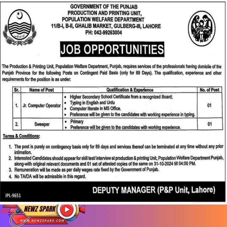 Computer Operator and Lower Grade Jobs in Population Welfare Department 2024