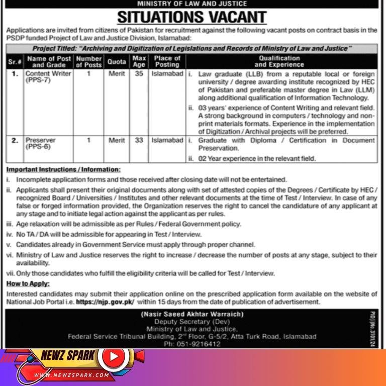 Content Writer and Preserver Jobs in Ministry of Law and Justice Islamabad 2024
