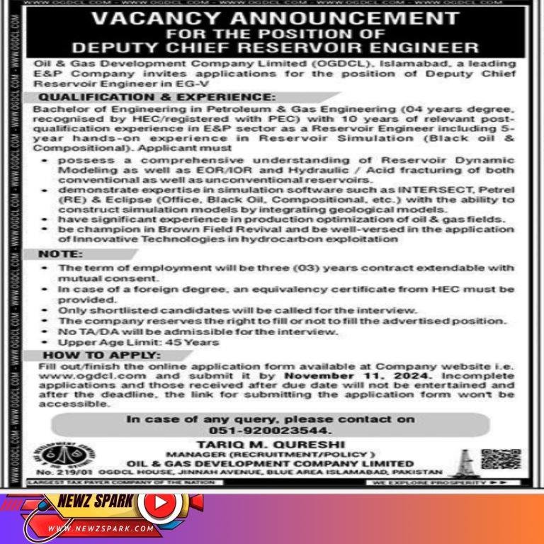 Deputy Chief Reservoir Engineer Job in Oil and Gas Development Company Limited 2024