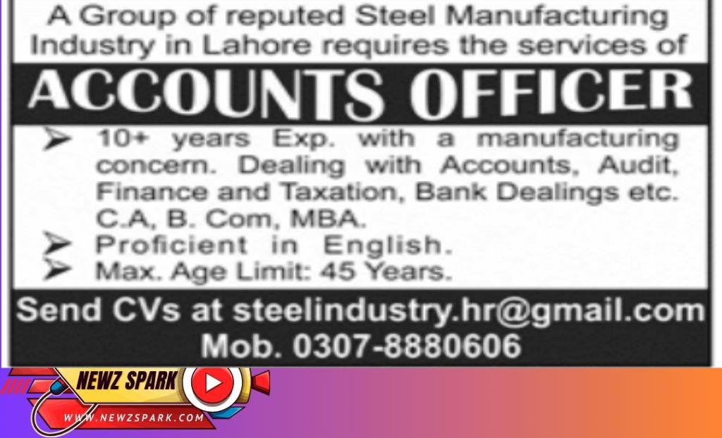 Job for Account Officer in Steel Manufacturing Industry Lahore 2024