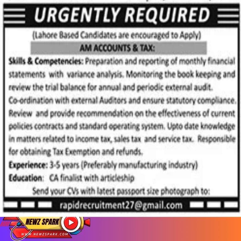 Accounts, AM, Assistant, CA, Career, Finalist, Jobs, Lahore, Manager, Pakistan, Tax