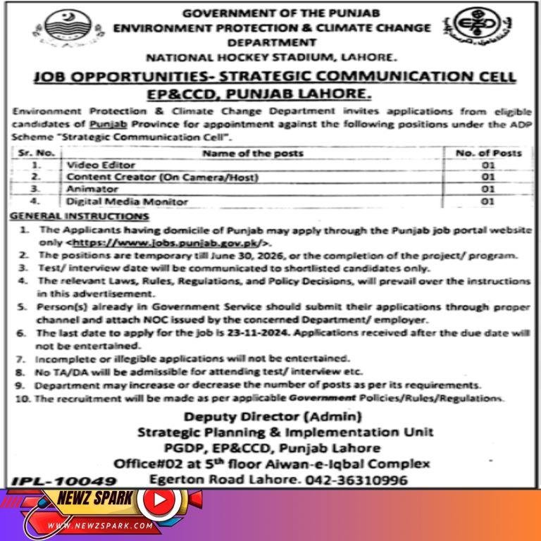 Job for Video Editor, Content Creator, Animator and Digital Media Monitor in Strategic Communication Cell Punjab 2024