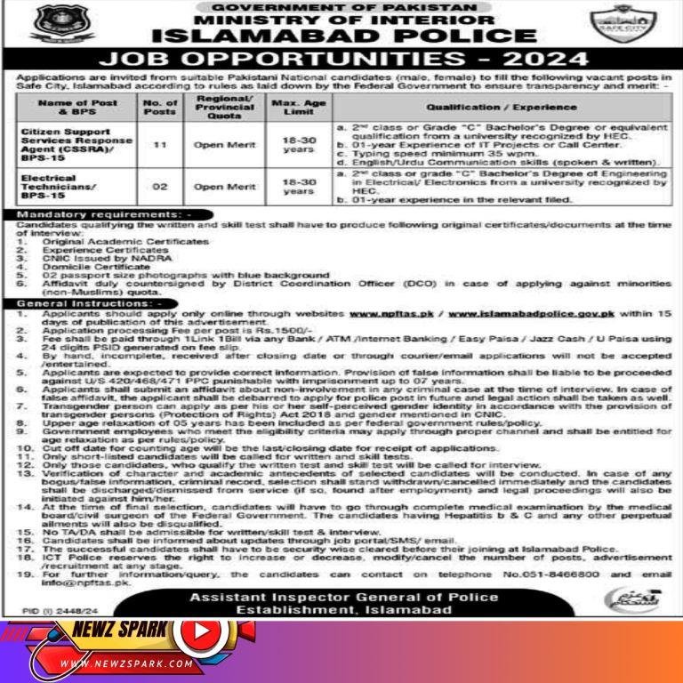 Jobs for Citizen Response Agent and Electrical Technician in Islamabad Police 2024