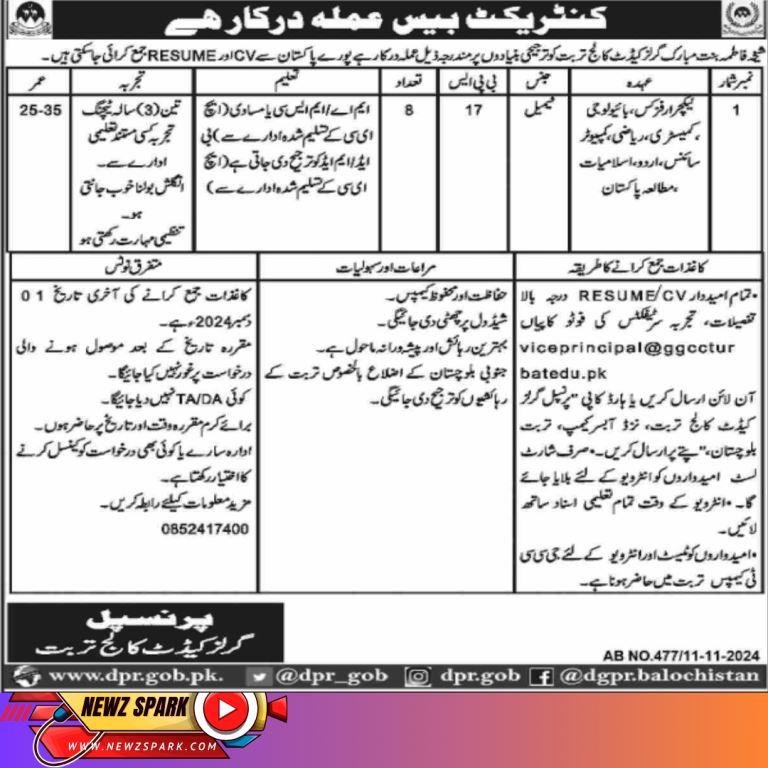 Jobs for Lecturer Physics, Biology, Chemistry, Math, Computer Science, Urdu, Islamiat and Pakistan Study in Girls Cadet College Turbat 2024