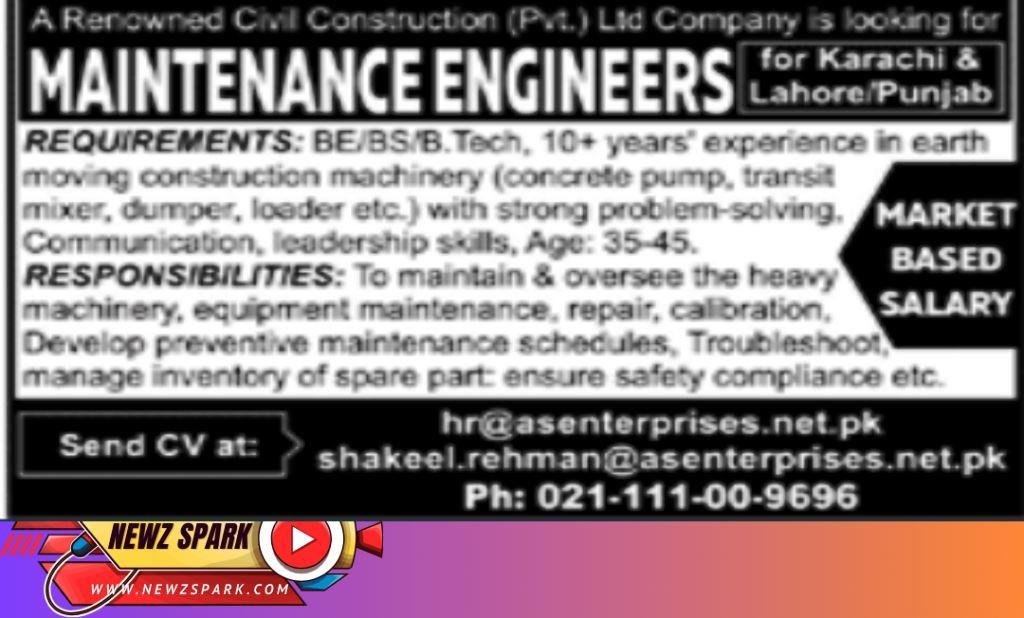 Jobs for Maintenance Engineers in Civil Construction Company 2024