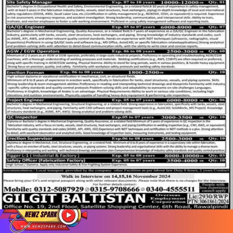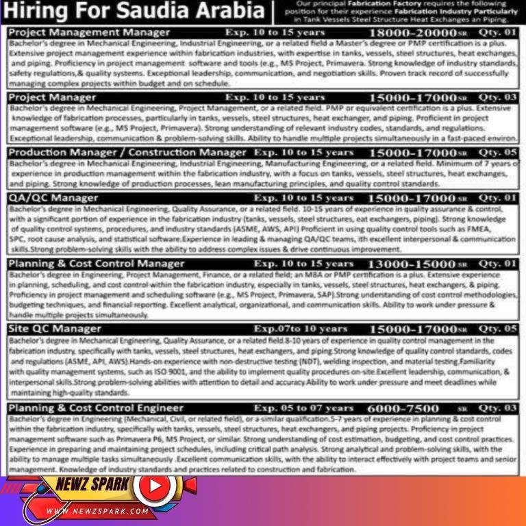 Jobs for Project Manager, Production, Cost, QC,Planning, Safety Manager, QC Inspector and Supervisor in Saudi Arabia 2024