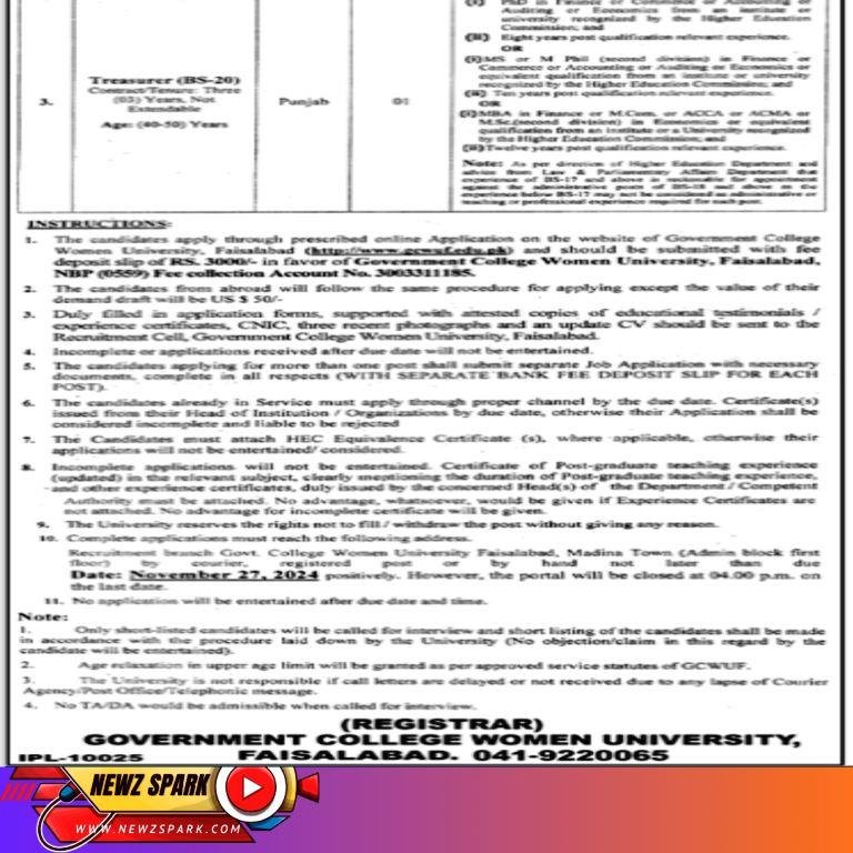 Jobs for Registrar, Controller Examination and Treasurer in Government College Women University Faisalabad 2024