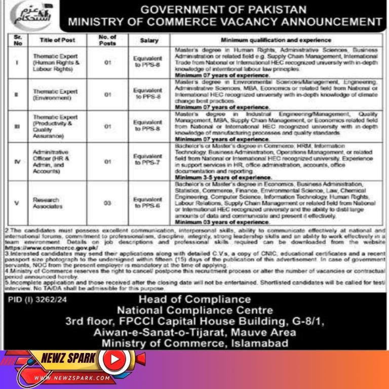 Jobs for Research Associates, Admin Officer and Human Rights, Labour Rights, Environment and Quality Experts in Ministry of Commerce Pakistan 2024