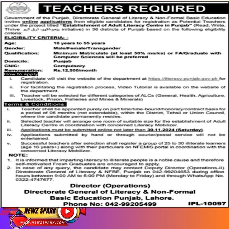 Jobs for Teachers in Adult Literacy Centres in Punjab 2024
