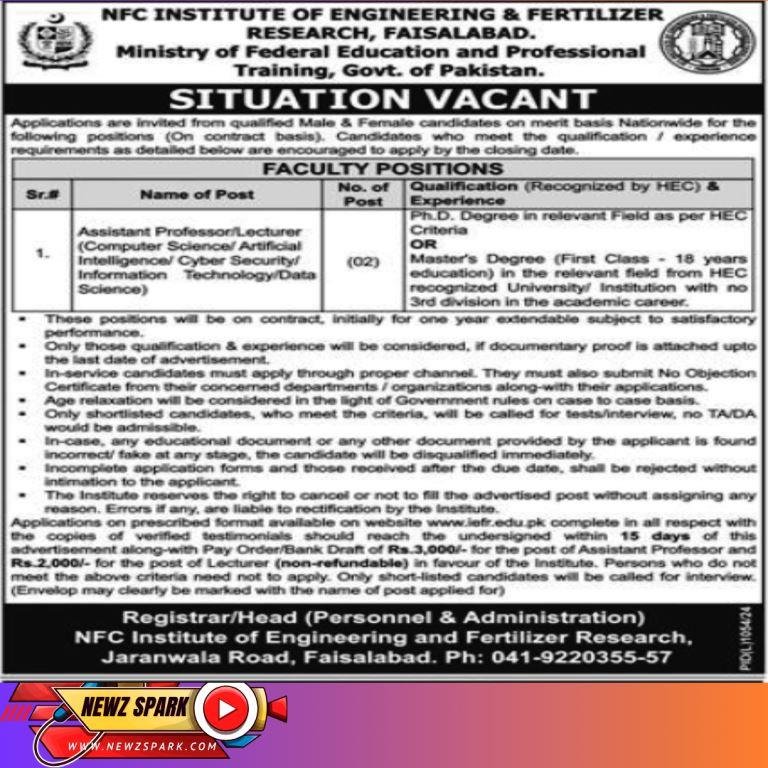 Lecturer and Assistant Professor Jobs in NFC Institute of Engineering and Fertilizer Research Faisalabad 2024