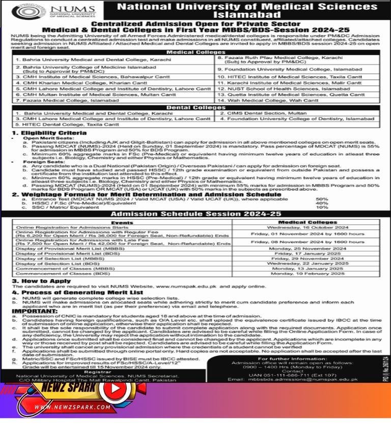 MBBS and BDS private admissions 2024 in National University of Medical Sciences Islamabad