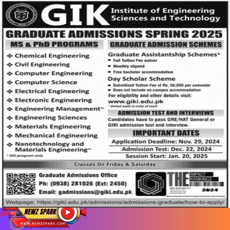 Notice for Graduate Admissions Spring 2025 in GIK Institute of Engineering Science and Technology