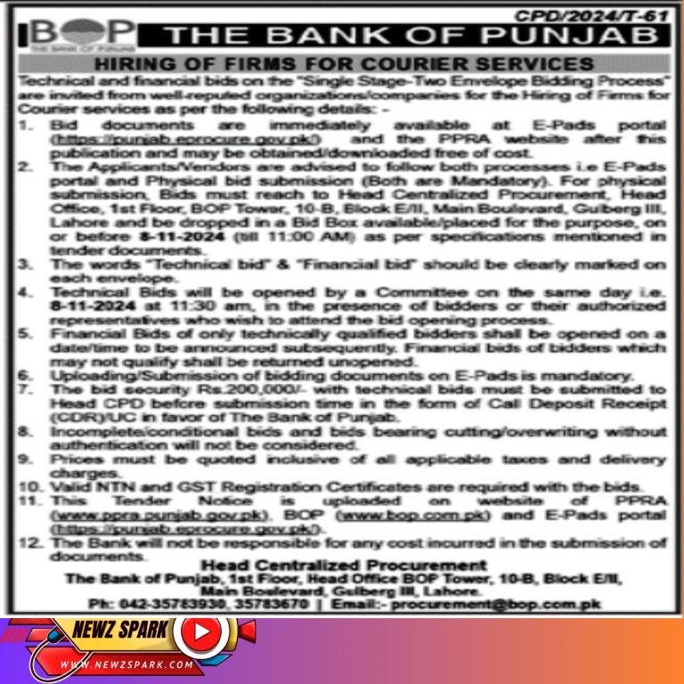 Bid, BOP, Courier, Lahore, Pakistan, Punjab, Services, Tender