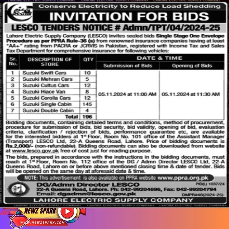 Tender for insurance company in LESCO lahore 2024
