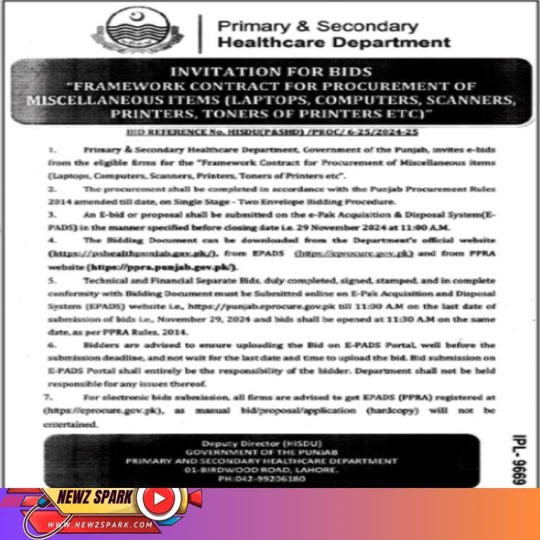 Tender for Laptops, Computer, Scanner and Printers in Primary and Secondary Health Department Punjab Lahore