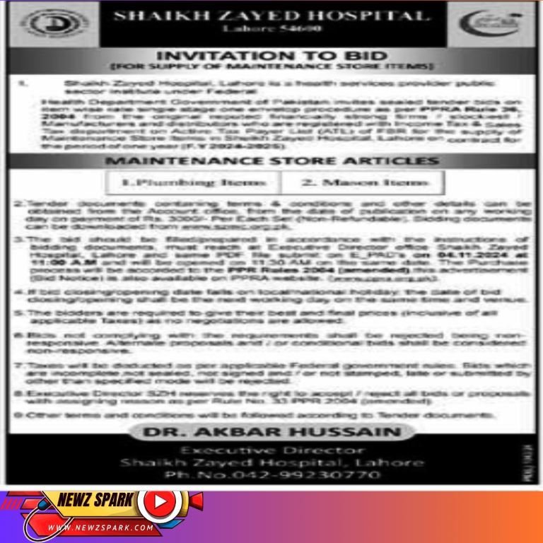 Tender for Maintenance Items in Sheikh Zayed Hospital Lahore 2024