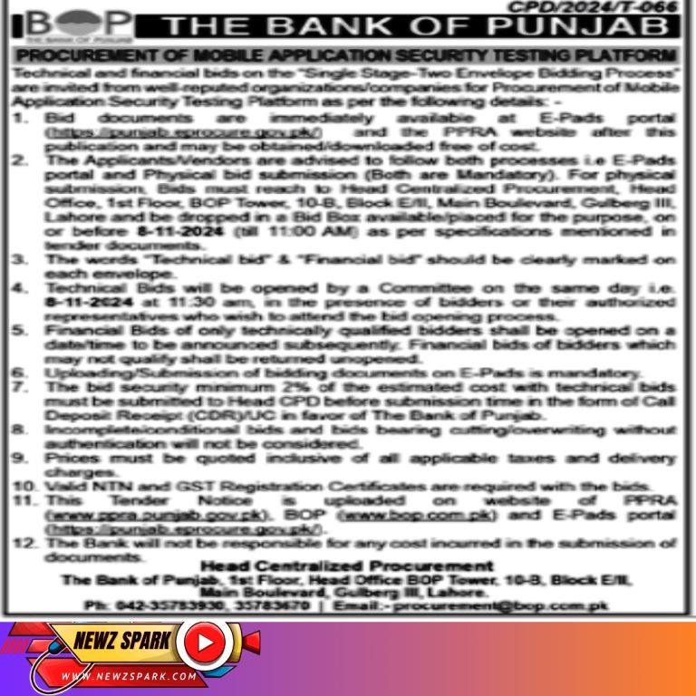 Tender for Mobile Application Security Platform in The Bank of Punjab 2024