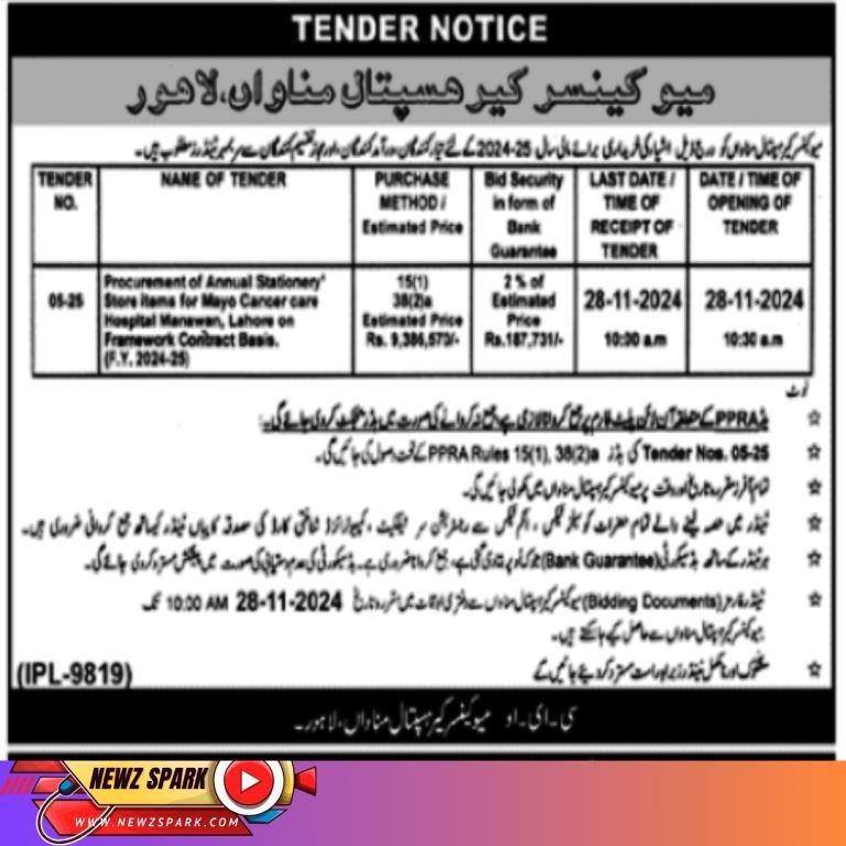 Tender for Stationery Items in Mayo Cancer Care Hospital Manawan Lahore 2024