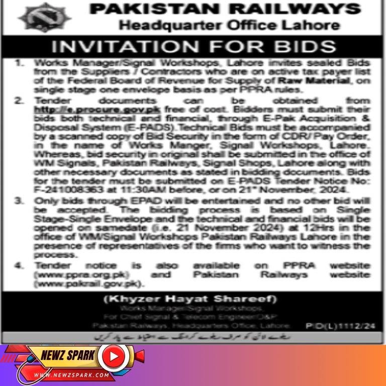 Tender for Suppliers and Contractors in Pakistan Railways 2024