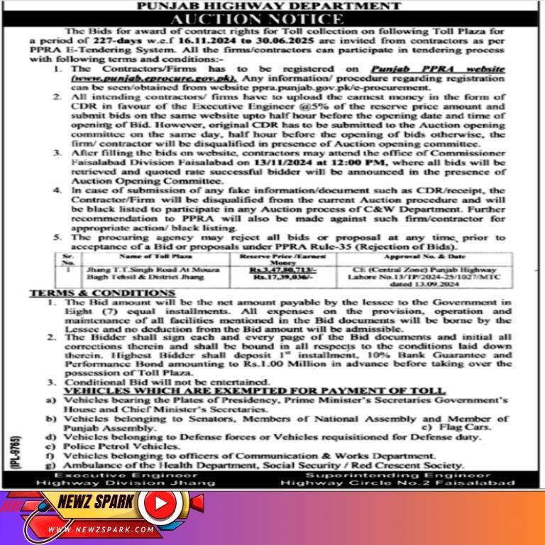 Tender for Toll Tax collection in Punjab Highway Department 2024
