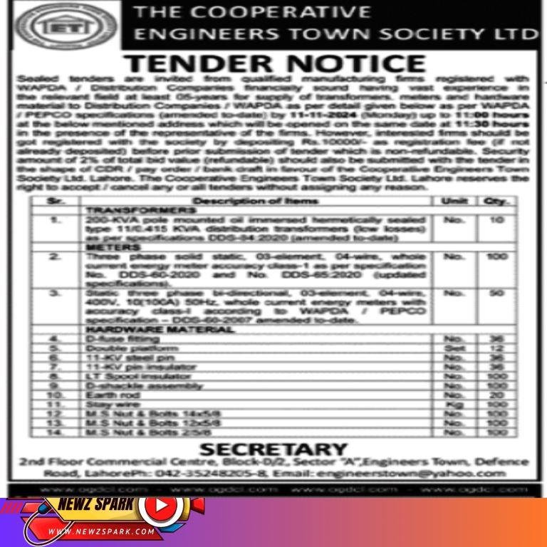 Tender for Transformers, Meters and Hardware Material in The Cooperative Engineers Town Society Limited 2024
