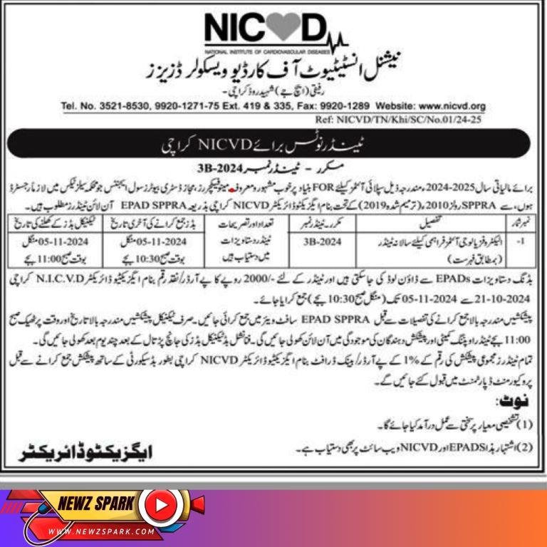 Tender for Treatment Tools in National Institute of Cardiovascular Diseases Karachi 2024