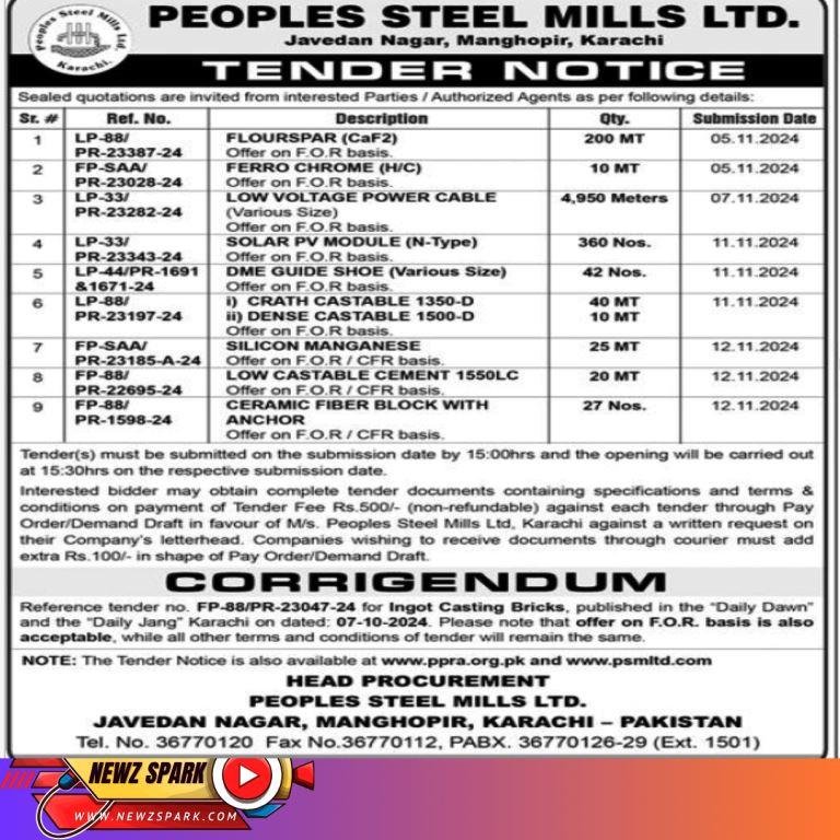 Tender for Various Items in Peoples Steel Mills Limited Karachi 2024